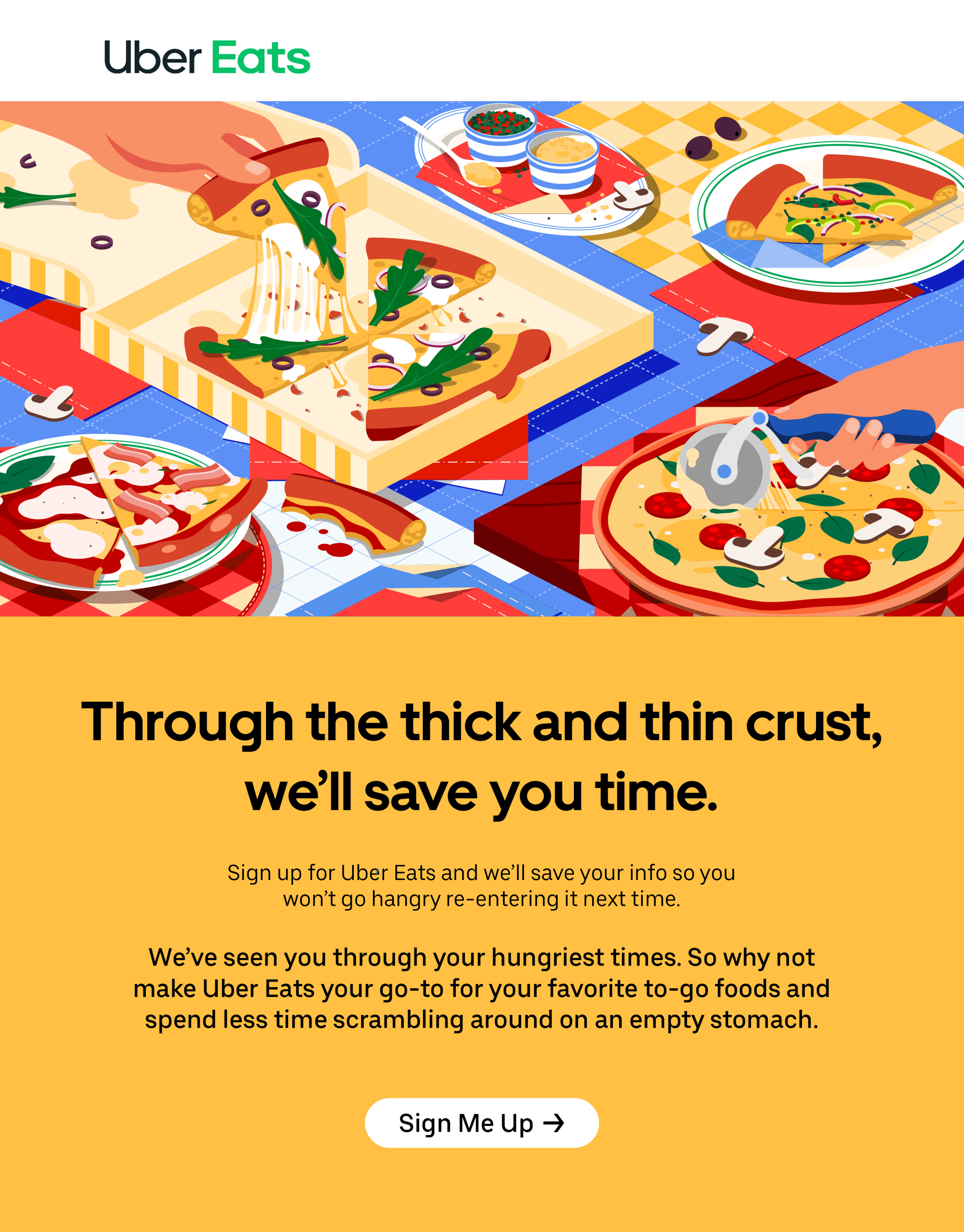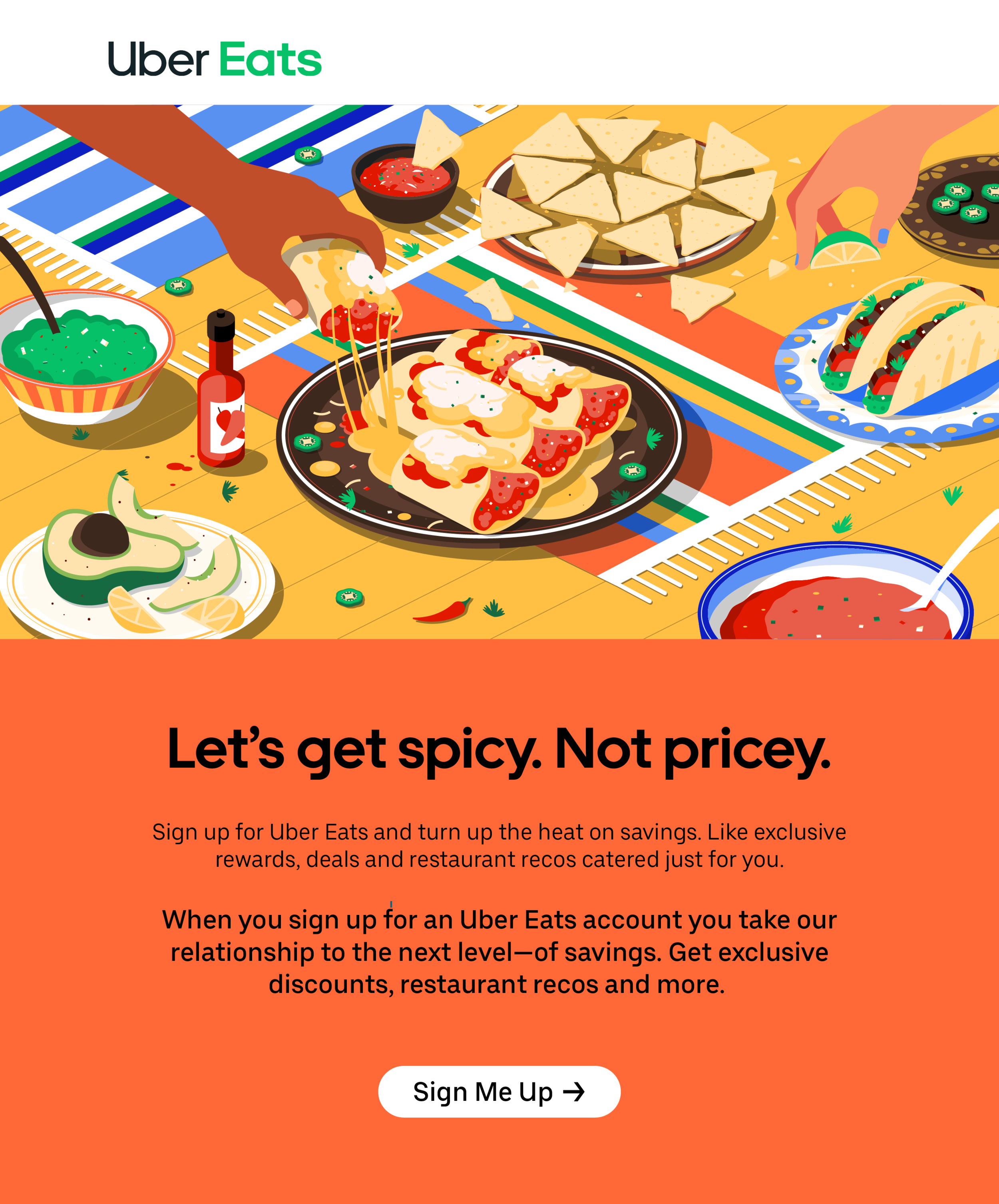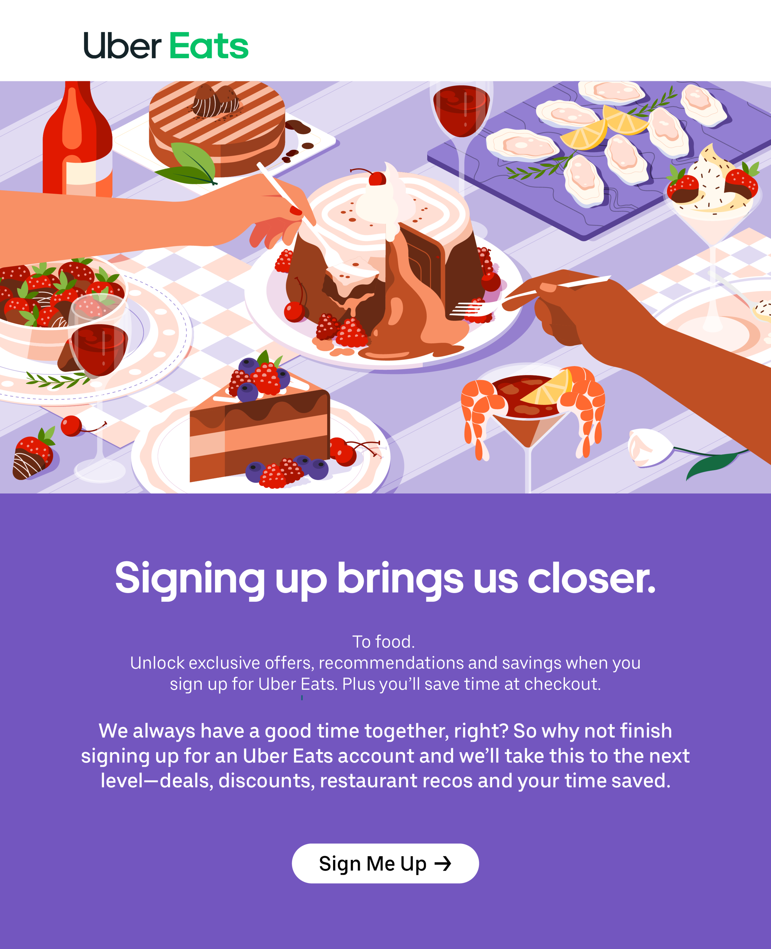 Uber Eats wants users to take the leap and sign up for an account instead of flirt around in guest checkout. The incentive? Skip through the nearly 12 steps you have to go through as a guest to get to your Eats sooner and get exclusive deals and discounts. No more hangry checkout. No more pricey take out. No more swiping around looking for deals. Sign up because Uber Eats is “the one”.